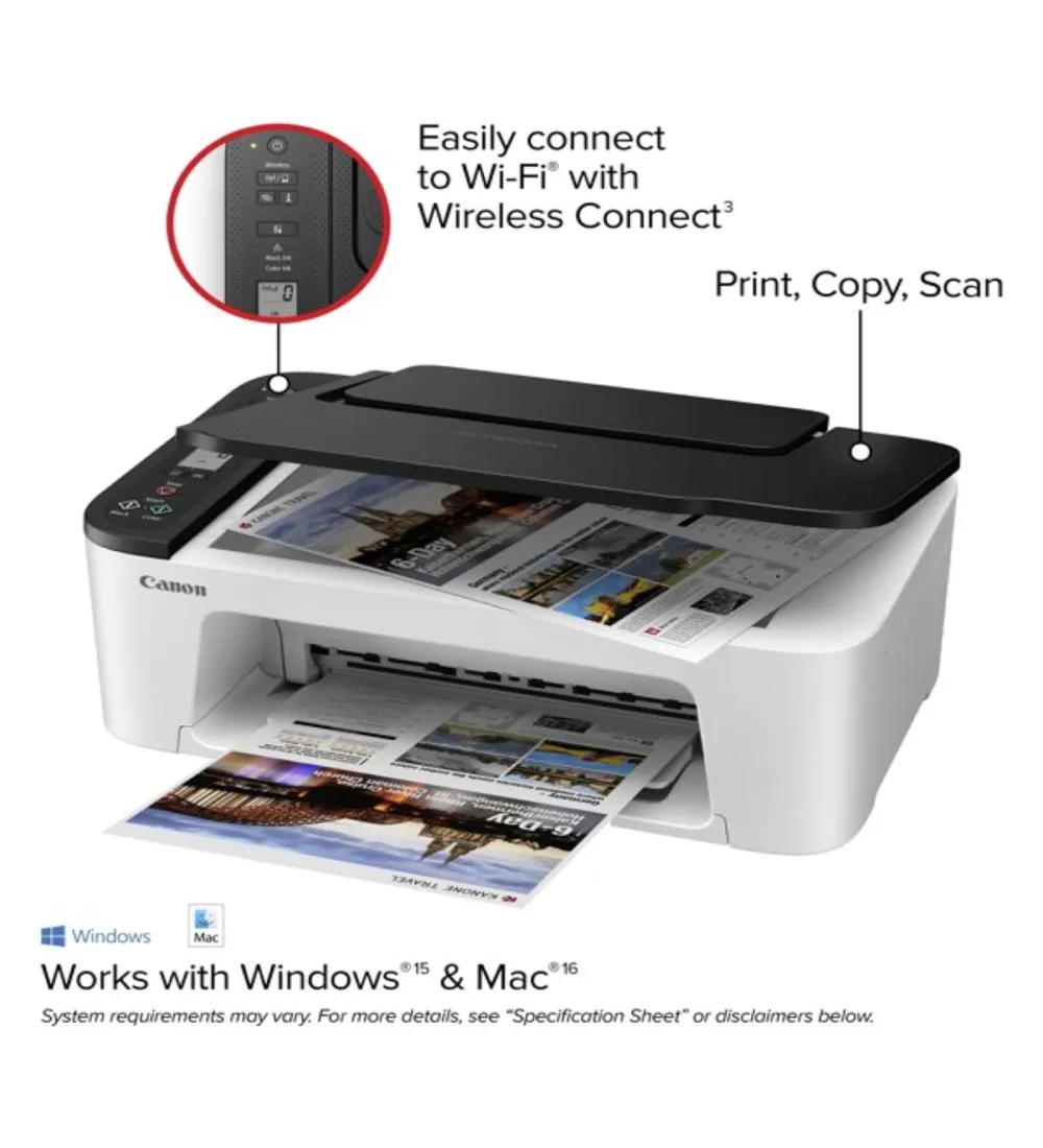 With the PIXMA BK Wireless All-in-One Printer, printing is now easy and straightforward. The Wireless PIXMA Bk is more than your typical printer thanks to its easy-to-replace 2-Cartridge FINE Hybrid Ink System, enhanced Wi-Fi setup via Wireless Connect3, a rear paper tray for speedy reloading of plain or picture paper, and a flatbed scanner. Additionally, printing is simple from laptops with built-in Wi-Fi, mobile devices using the PRINT app1, AirPrint, and Mopria Print Service.
